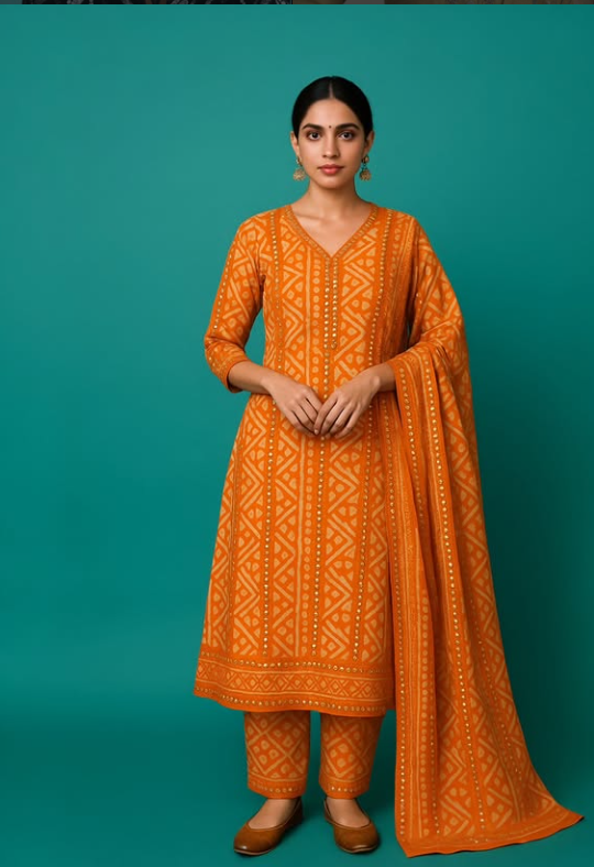 The Amber Heritage Set celebrates the warmth of Indian tradition with a contemporary silhouette. Crafted for those who love “everyday ethnic” luxury, this three-piece suit set is dominated by a rich mustard-orange tone and intricate white geometric patterns. The V-neckline and straight-cut tailoring provide a clean, professional look, while the soft cotton-blend fabric ensures you stay fresh from morning meetings to evening family gatherings.